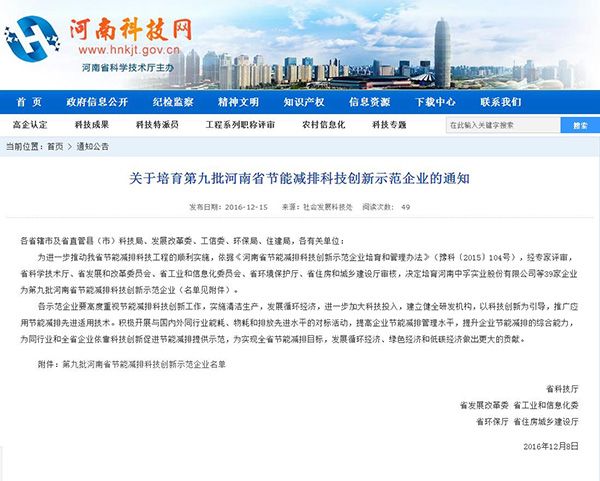 熱烈祝賀我公司于2016年度喜獲《河南省節(jié)能減排科技創(chuàng)新示范企業(yè)》,是2016年鶴壁市唯一一家獲此殊榮的企業(yè)。