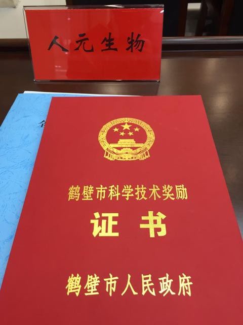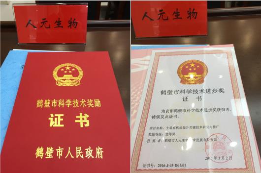 2017年3月27日,鶴壁市人民政府發(fā)布《關(guān)于2016年度鶴壁市科學(xué)技術(shù)獎(jiǎng)勵(lì)的決定》,鶴壁市人元生物技術(shù)發(fā)展有限公司的“土壤有機(jī)質(zhì)提升關(guān)鍵技術(shù)研發(fā)與推廣”項(xiàng)目榮獲鶴壁市科學(xué)技術(shù)進(jìn)步獎(jiǎng)一等獎(jiǎng)。